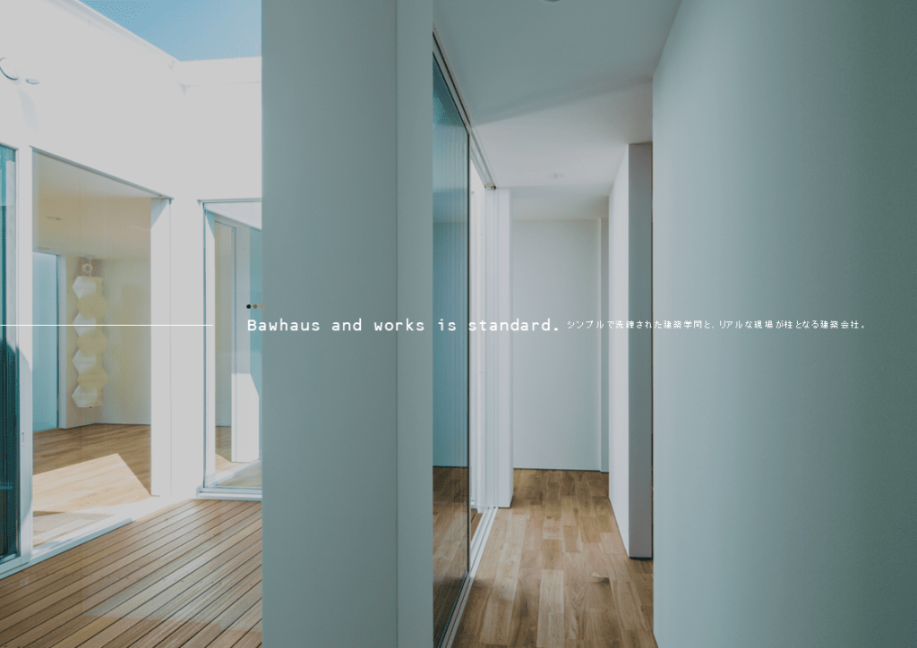 近代美術にまで影響を与えた建築学問(Bauhaus)と職人によるリアルな現場仕事(Works)どちらが欠けても実現することのない家づくりを表現し、 それらが柱(Standard)となることでブレないモノづくりができる会社であることを表しています。