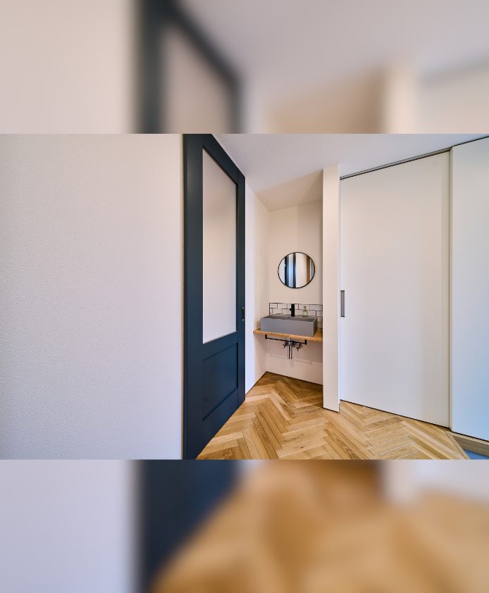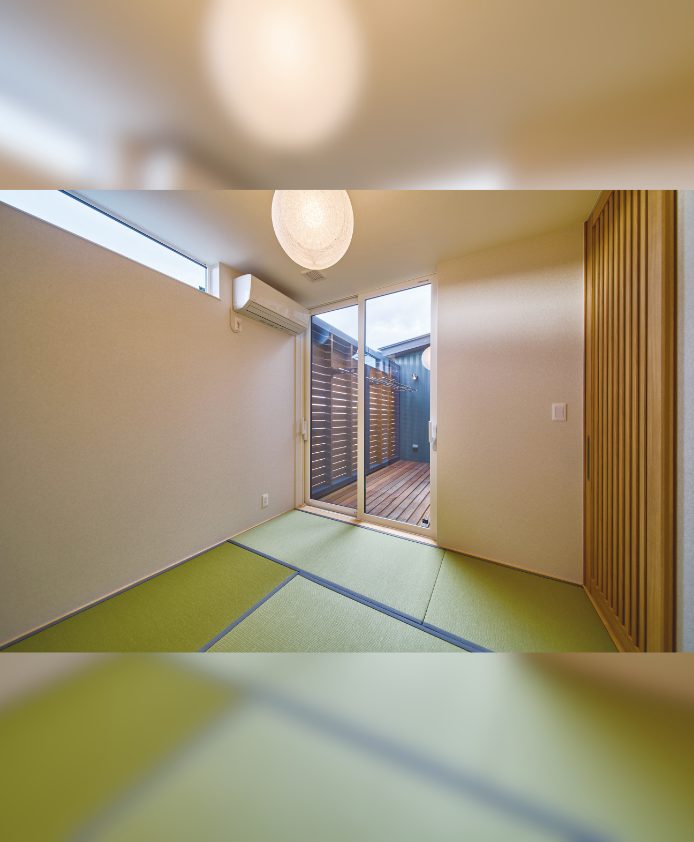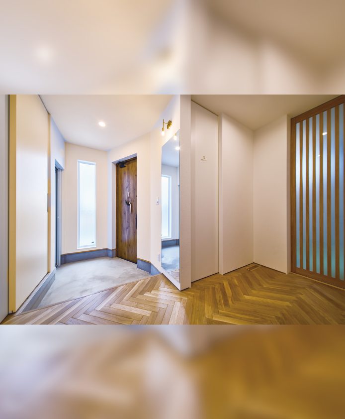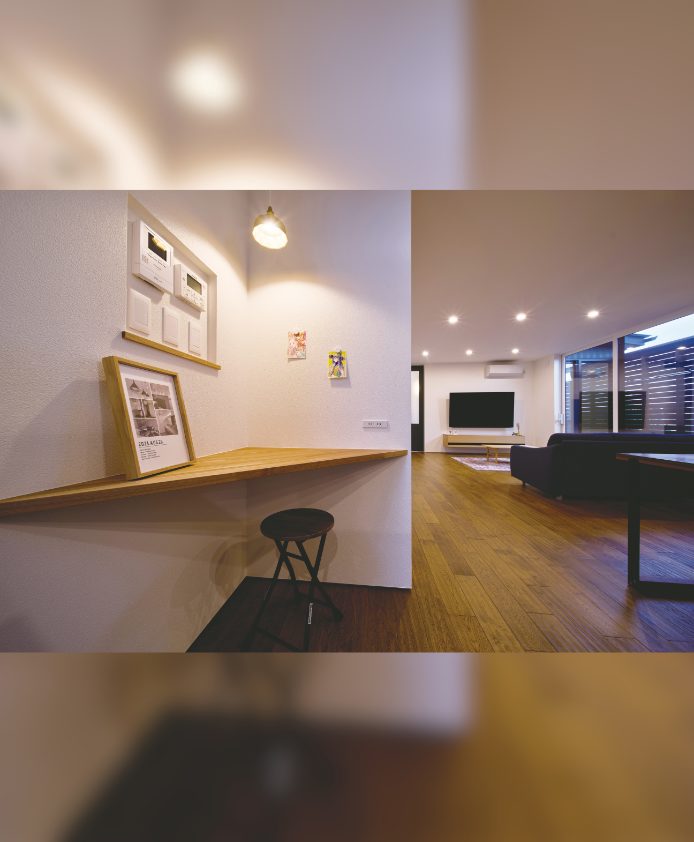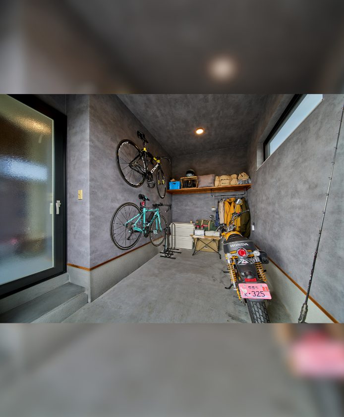 | ポイント | 外観はモスグリーンに木目がアクセント。モールテックスが映えるLDK、敷地を余すところなく活かした無駄のない間取りが特徴。アウトドア大好きなご夫婦が叶えたバイクガレージ付きの平屋住宅です。 |